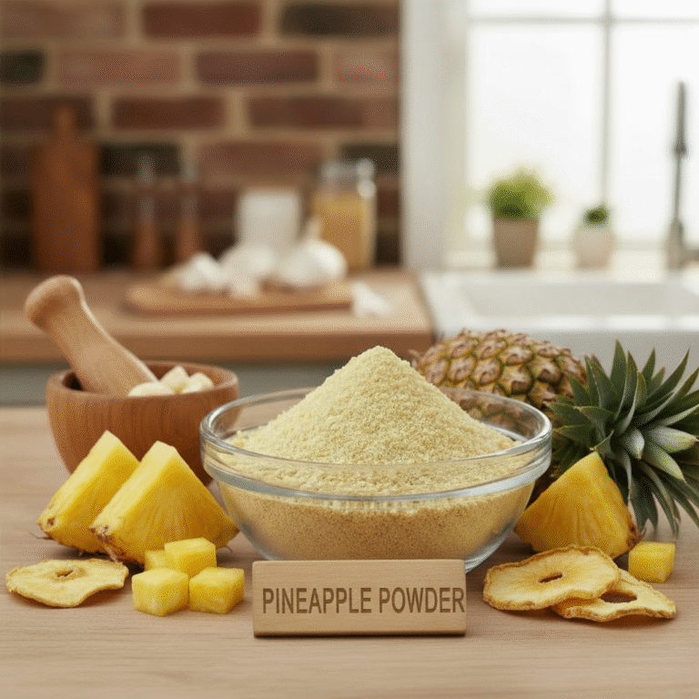 Dehydrated Pineapple Powder is made from fresh, ripe pineapples that are cleaned, peeled, sliced, and dehydrated under controlled hygienic conditions to retain their natural sweetness, tropical aroma, and bright flavor. The result is a fine, free-flowing powder that serves as a convenient and long-lasting alternative to fresh pineapple. It is widely used in beverages, bakery products, confectionery, and health supplements.